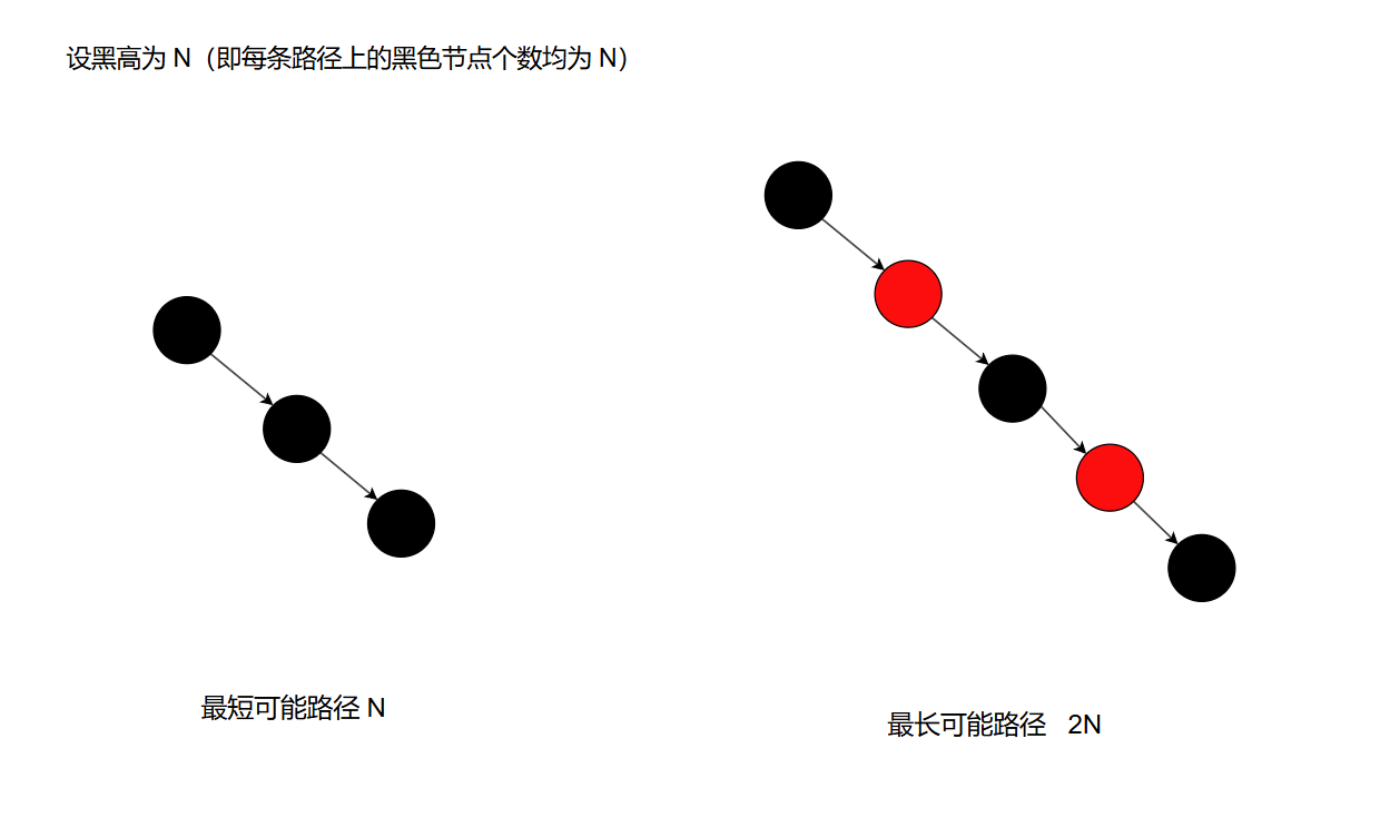 - 黑色高度 :从根节点到任意 NULL 节点的所有路径上,黑色节点的数量都相同。