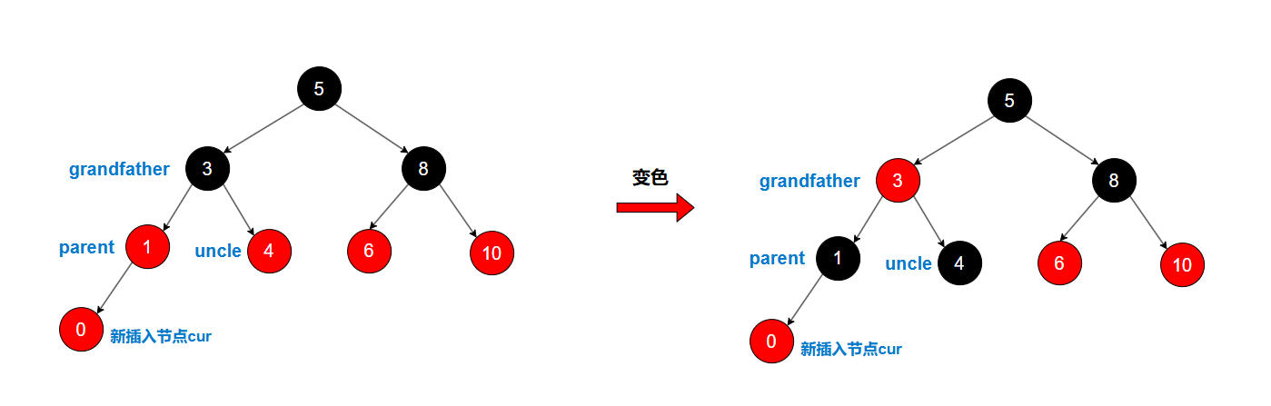 当parent和uncle都是红色,grandfather是黑色时,新插入节点会导致出现两个连续红色节点,触发变色,parent和uncle变成黑色,grandfather变成红色,这样就满足了红黑树的性质。
