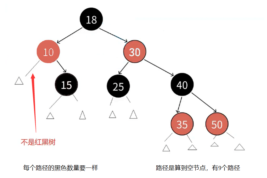 - 叶子节点 :所有叶子节点(即 NULL 节点/空指针)均为黑色。