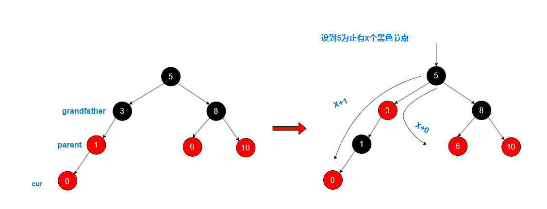 - 红色约束 :如果一个节点是红色,则其子节点必须是黑色。路径上不能有连续的红色节点。**