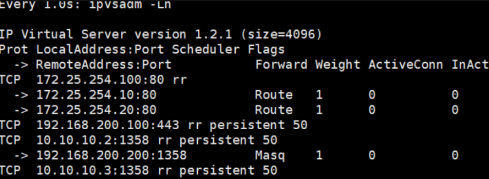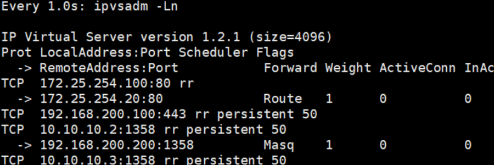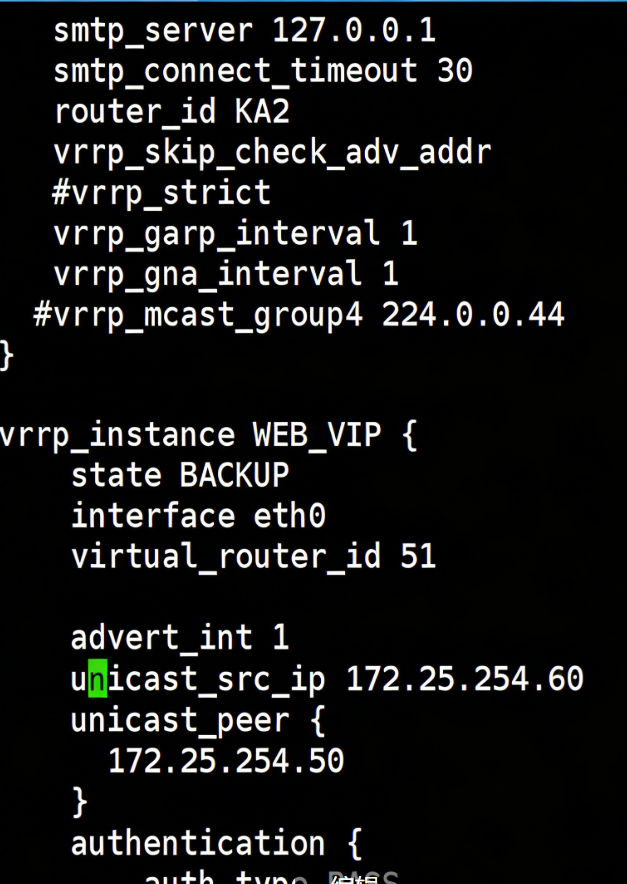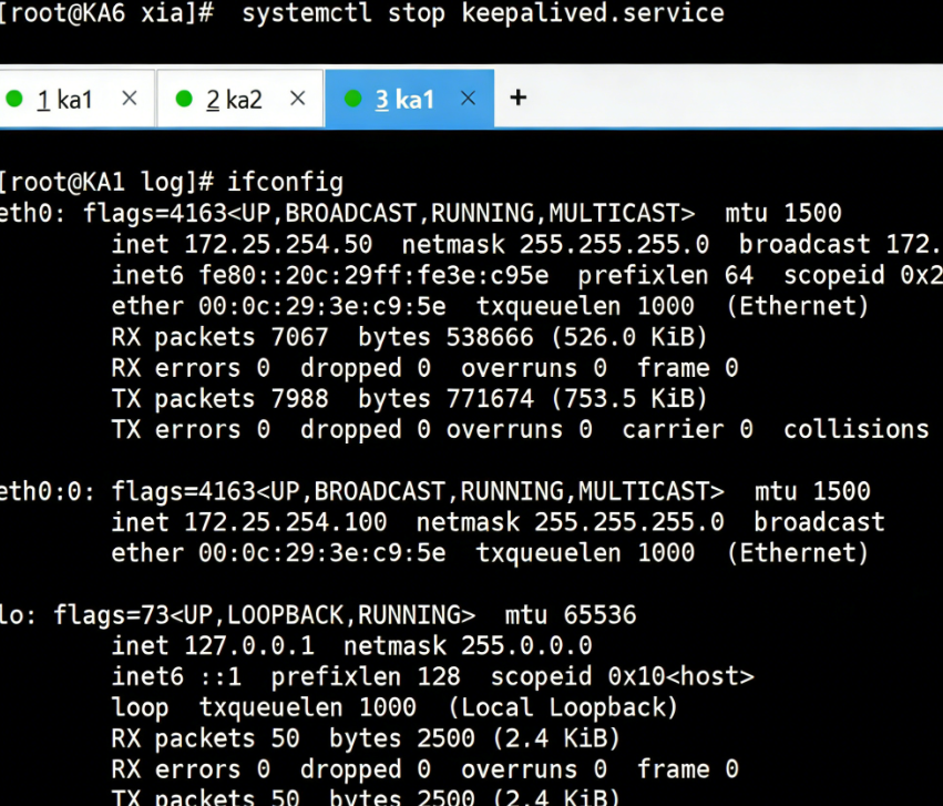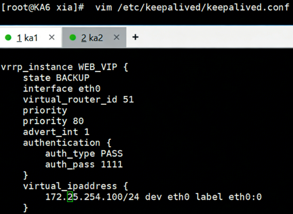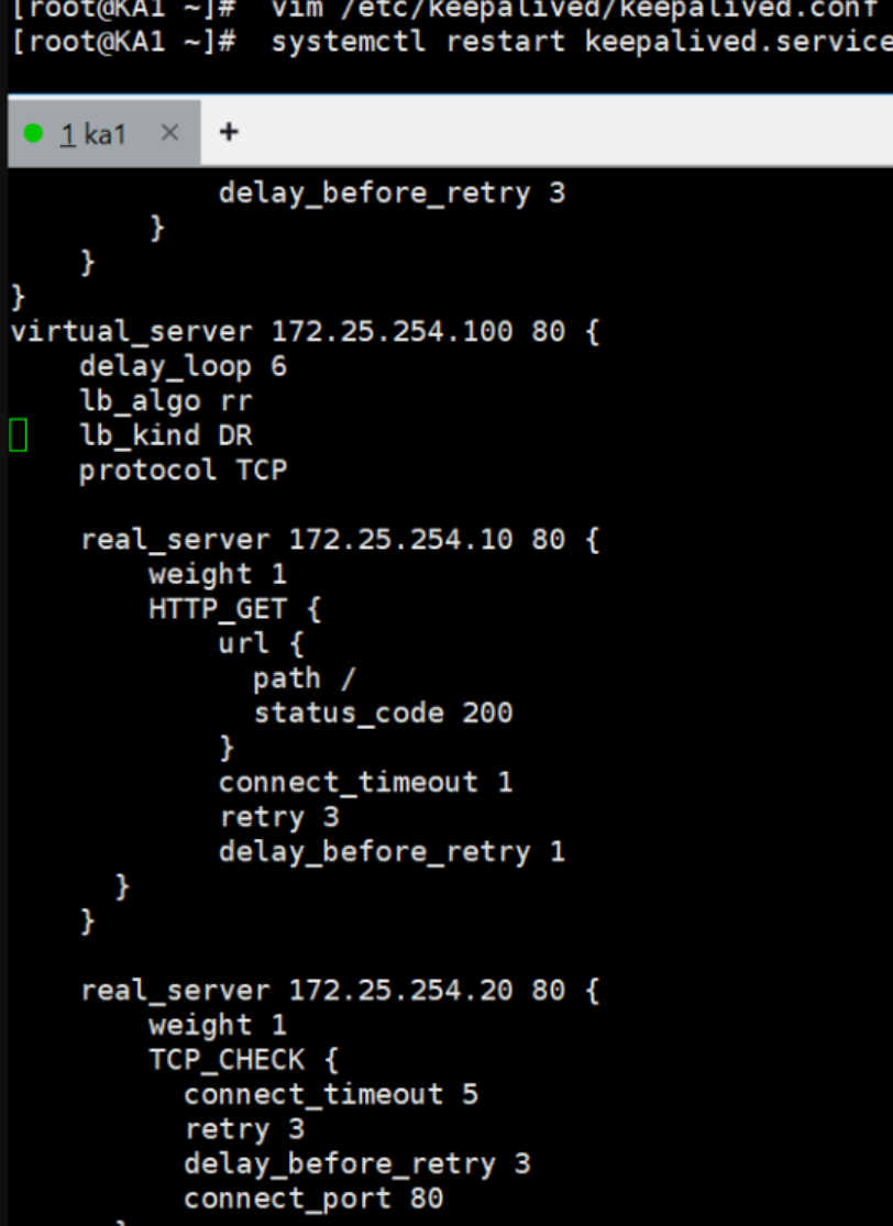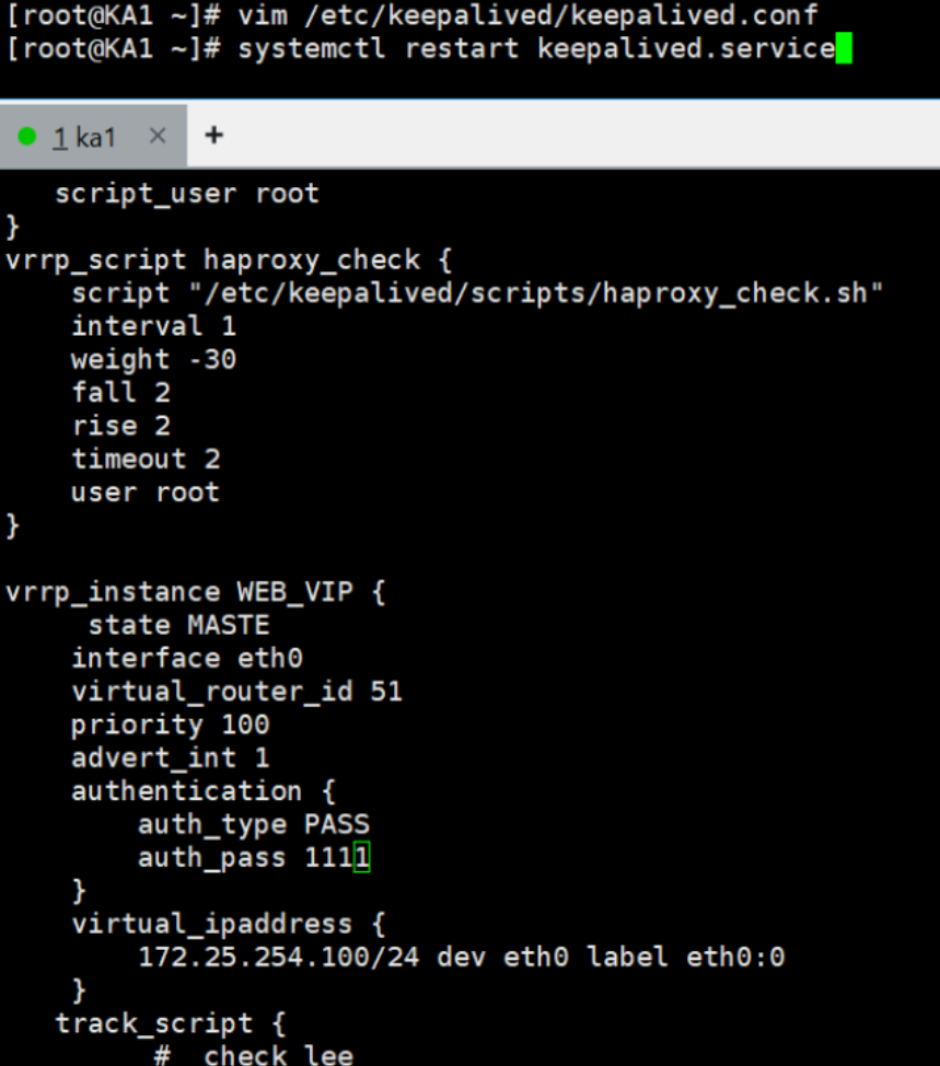 root@rs1 \~\]# vmset.sh eth0 172.25.254.10 rs1 \[root@rs1 \~\]# dnf install httpd -y \[root@rs1 \~\]# echo RS1 - 172.25.254.10 \> /var/www/html/index.html \[root@rs1 \~\]# systemctl enable --now httpd \[root@rs2 \~\]# vmset.sh eth0 172.25.254.20 rs2 \[root@rs2 \~\]# dnf install httpd -y \[root@rs2 \~\]# echo RS2 - 172.25.254.20 \> /var/www/html/index.html \[root@rs2 \~\]# systemctl enable --now httpd \[root@KA1 \~\]# vmset.sh eth0 172.25.254.50 KA1 \[root@KA2 \~\]# vmset.sh eth0 172.25.254.60 KA6 ka1本地解析  设置时间同步 ka2查看  #### Keepalived虚拟路由配置 ka1 \[root@KA1 xia\]# mount /dev/sr0 /mnt mount: /mnt: WARNING: source write-protected, mounted read-only. \[root@KA1 xia\]# dnf install keepalived.x86_64 -y ka2 \[root@KA6 xia\]# mount /dev/sr0 /mnt mount: /mnt: WARNING: source write-protected, mounted read-only. \[root@KA6 xia\]# dnf install keepalived.x86_64 -y Ka1  Ka2  记得要使用 当KA1 故障时  在KA2中看vip是否被迁移到当前主机(ipconfig) ### Keepalived的子文件设定 Ka1(改两个文件)   非抢占模式(文件修改后要使用systemctl stop keepalived.service) Ka1 \[root@KA1 log\]# vim /etc/keepalived/conf.d/webvip.conf  Ka2  测试 \[root@KA6 xia\]# systemctl start keepalived.service \[root@KA1 log\]# systemctl start keepalived.service   keepalived的单播模式   ka2  测试 \[root@KA1 xia\]# tcpdump -i eth0 -nn src host 172.25.254.50 and dst 172.25.254.60 \[root@KA2 xia\]# tcpdump -i eth0 -nn src host 172.25.254.60 and dst 172.25.254.50 \[root@KA1 log\]# systemctl stop keepalived.service  \[root@KA1 log\]# systemctl start keepalived.service IPVS的高可用性 \[root@rs1/2 xia\]# cd /etc/NetworkManager/system-connections/ \[root@rs1/2 system-connections\]# ls eth0.nmconnection \[root@rs1/2 system-connections\]# cp eth0.nmconnection lo.nmconnection -p \[root@rs1/2 system-connections\]# vim lo.nmconnection  \[root@rs1/2 system-connections\]# vim /etc/sysctl.conf  \[root@rs1/2 system-connections\]# sysctl -p net.ipv4.conf.all.arp_ignore = 1 net.ipv4.conf.all.arp_announce = 2 net.ipv4.conf.lo.arp_announce = 2 net.ipv4.conf.lo.arp_ignore = 1 #安装ipvsadm \[root@KA1/KA2 \~\]# dnf install ipvsadm -y ka1ka2  测试 \[root@KA1 \~\]# watch -n 1 ipvsadm -Ln  在RS1中关闭wen服务 \[root@rs1 system-connections\]# systemctl stop httpd.service  \[root@KA1 \~\]# systemctl stop keepalived.service  Keepalived + HAProxy 是生产环境最常用的高可用负载均衡架构: 1. HAProxy:实现七层负载均衡、会话保持、后端 RS 健康检测; 2. Keepalived:为 HAProxy 提供 VIP 漂移,解决 HAProxy 单点故障; 3. 核心流程:客户端访问 VIP → Keepalived 将 VIP 绑定到主 HAProxy 节点 → HAProxy 将请求转发到后端 RS → 主 HAProxy 故障 → Keepalived 漂移 VIP 到备 HAProxy 节点 → 服务不中断。 实验 \[root@KA1 \~\]# vim /etc/keepalived/scripts/haproxy_check.sh  \[root@KA1 \~\]# systemctl restart haproxy.service  \[root@KA1 \~\]# systemctl stop haproxy.service