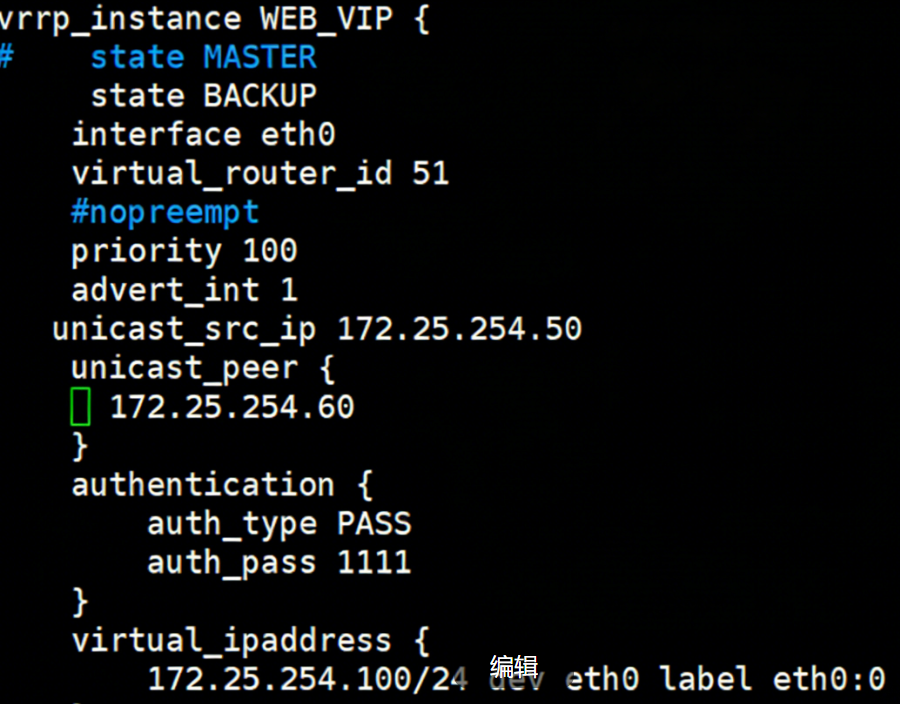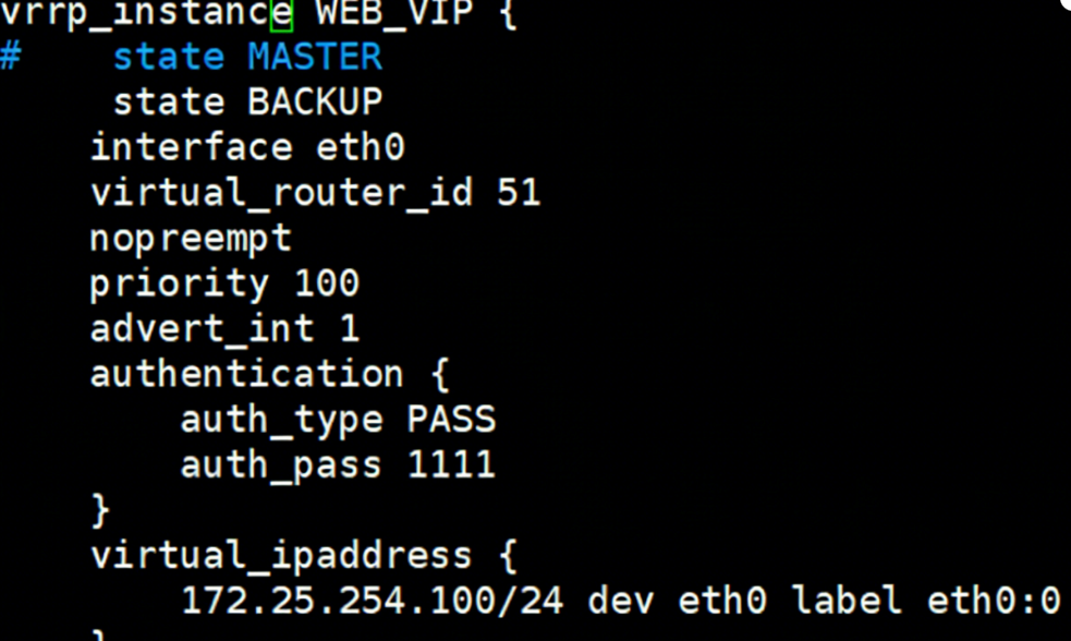 vrrp_instance:VRRP 实例配置,核心定义 VIP、主备状态、优先级、认证方式、通信规则;