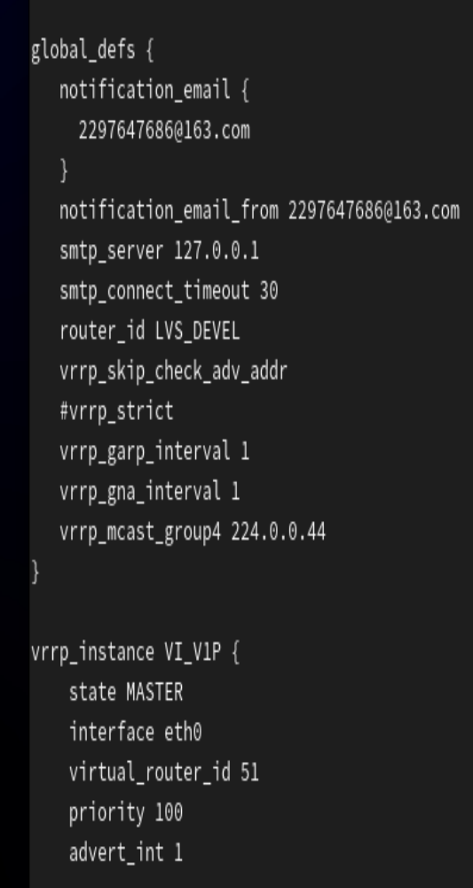 global_defs:全局配置,含邮件告警、router_id、VRRP 全局参数(如关闭 vrrp_strict);