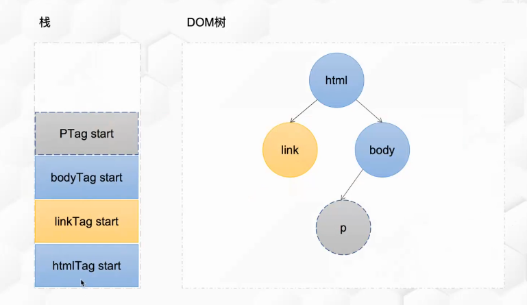 解析器接收Token流,通过栈结构来维护DOM树的层级关系:
