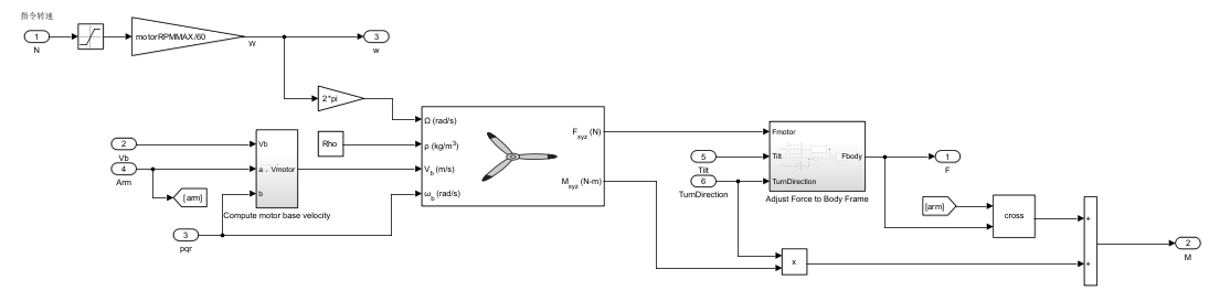 来流风速 :输入Vb,pqr,Arm为机体线速度,机体角速度,和旋翼安装力臂。计算电机基座速度是因为无人机的旋翼再机臂末端,除了整体的前飞速度外,还有一个额外的线速度