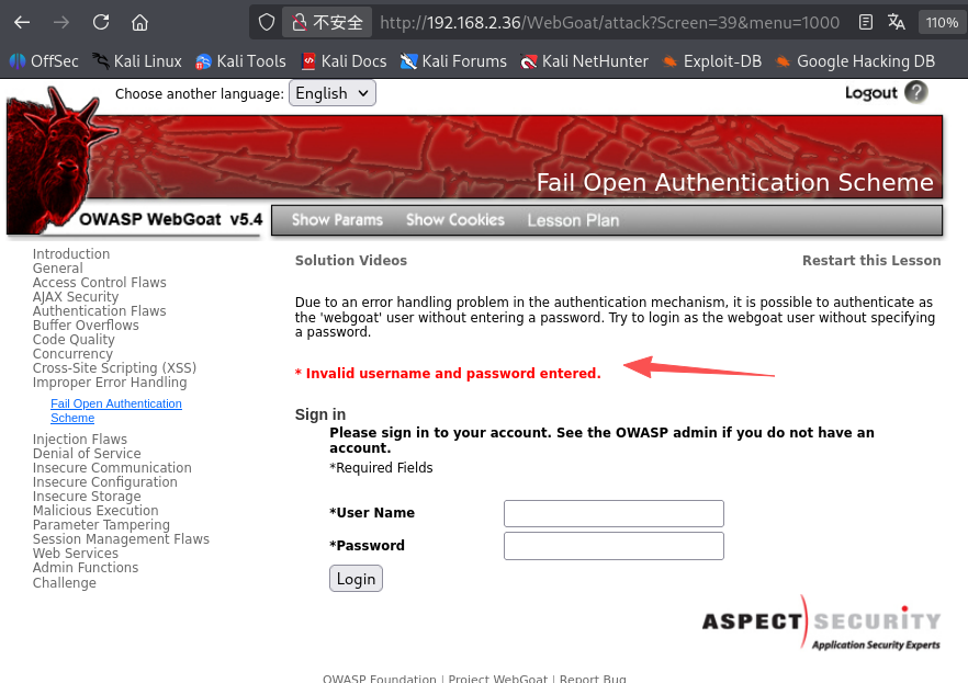 只输入用户名(webgoat)进行登录,可以看到网页是无效登录