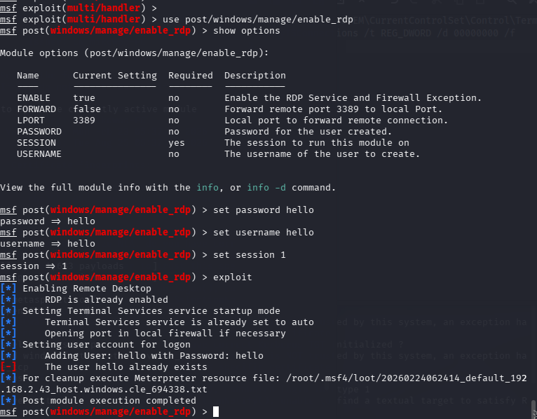 use post/windows/manage/enable_rdp 创建远程桌面的用户名和密码