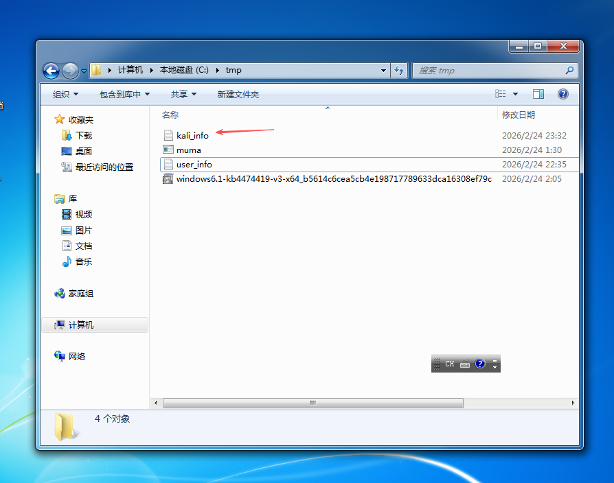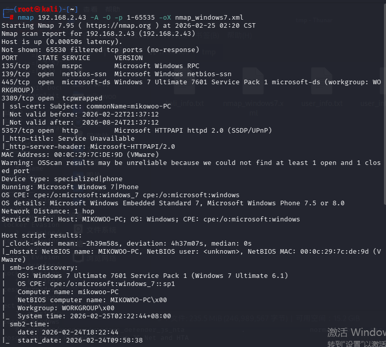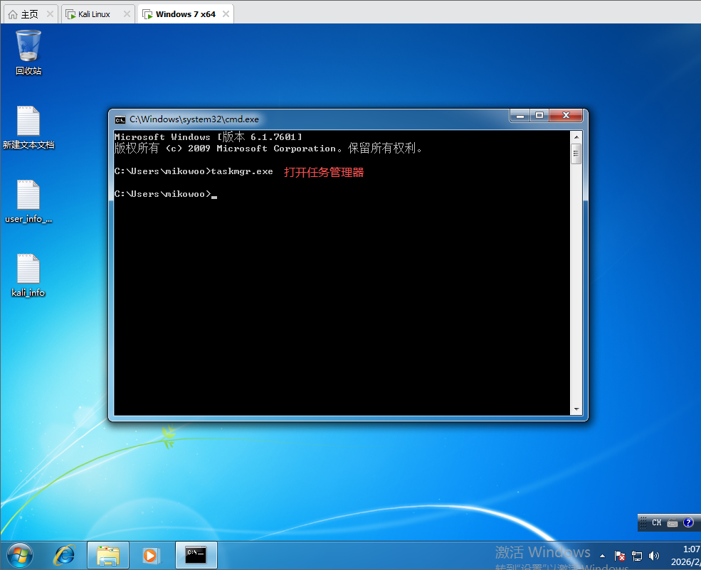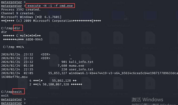 在目标机 Windows7上运行木马文件,并返回KaLi Linux 查看监听