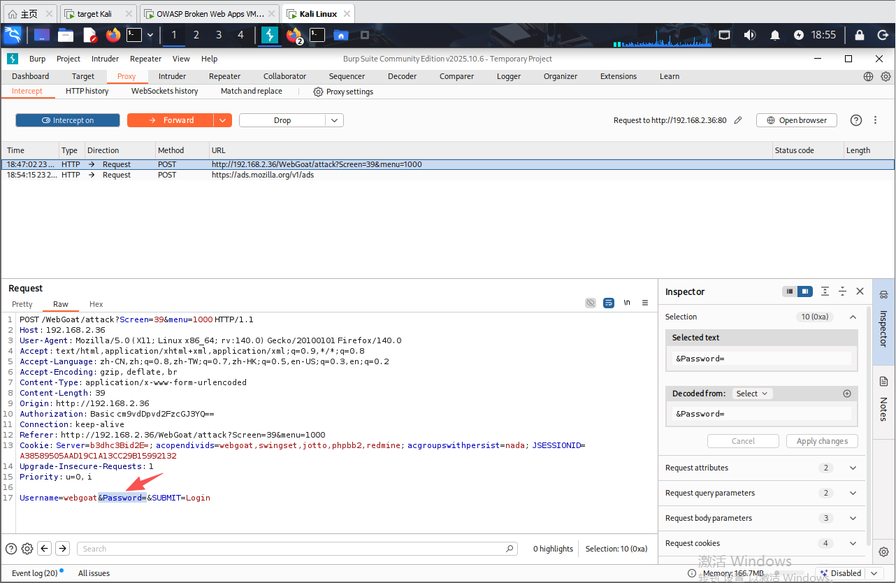 可以在BurpSuite中看到用户名、密码、登录的拦截信息