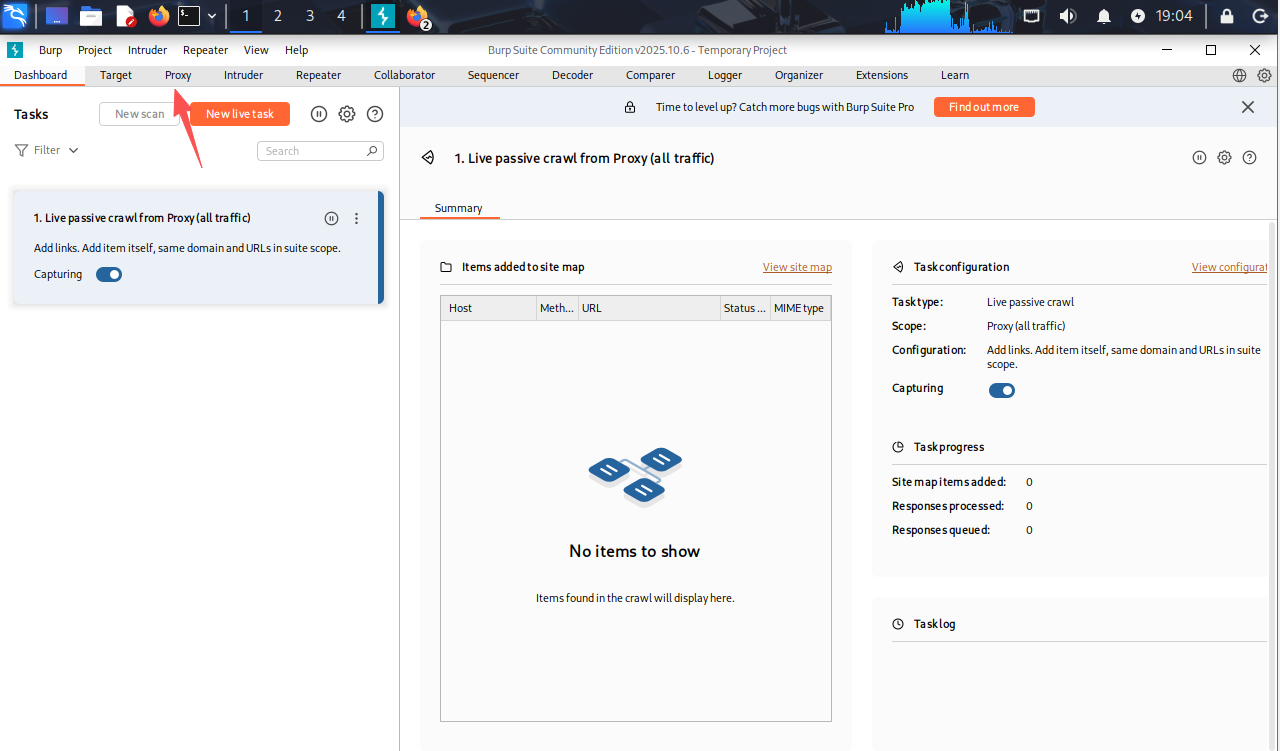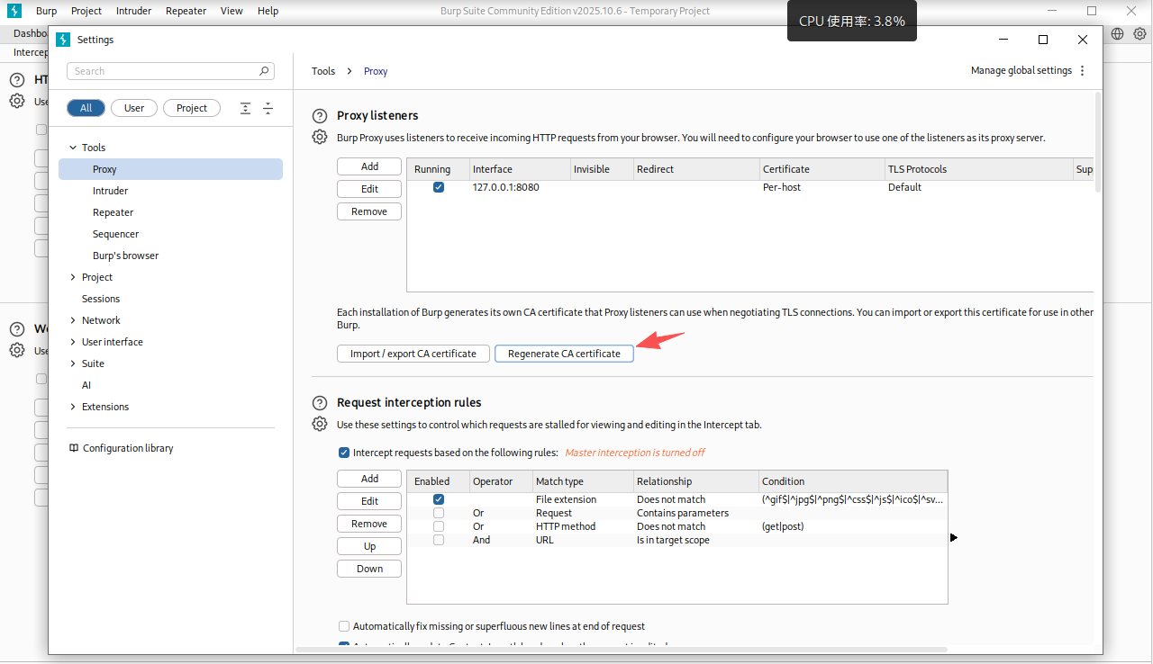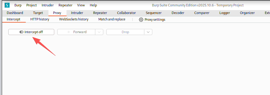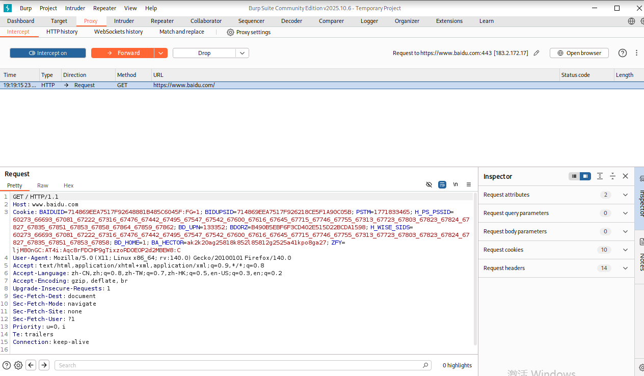 BurpSuite 开启 Intercept on拦截功能,浏览器访问 www.baidu.com 进行测试效果