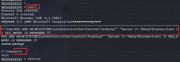 REG ADD HKLM\SYSTEM\CurrentControlSet\Control\Terminal" "Server /v fDenyTSConnections /t REG_DWORD /d 00000000 /f