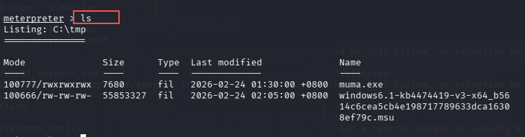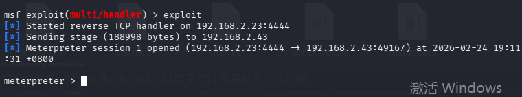 可以看到监听成功,并且Metasploit 与目标主机之间建立 Meterpreter 会话