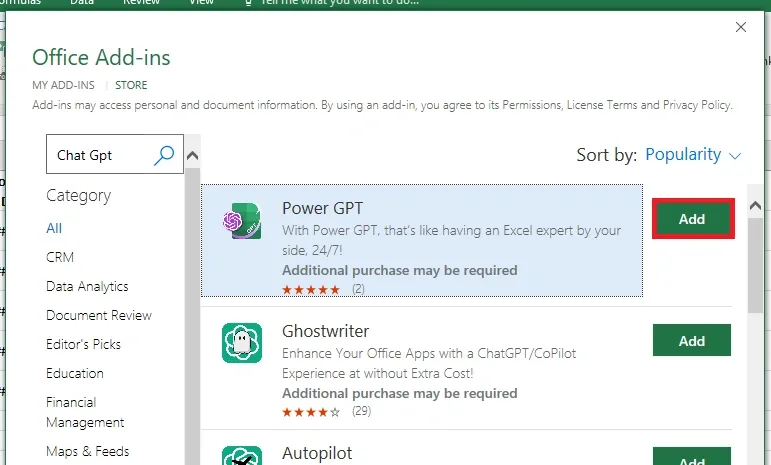 在加载项商店中,找到搜索栏 。在这里,您可以找到各种各样的工具来增强您的 Excel 使用体验。浏览Microsoft Office 加载项 ,发现各种效率工具,包括ChatGPT 集成 。