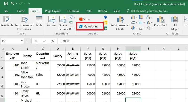 打开Excel 应用程序 ,然后导航到 屏幕顶部功能区 中的"插入"选项卡。此选项卡包含用于插入表格 、图表 和加载项 等对象的各种工具。在工具栏中查找****"获取加载项"**** 或****"Office 加载项"**** 选项。