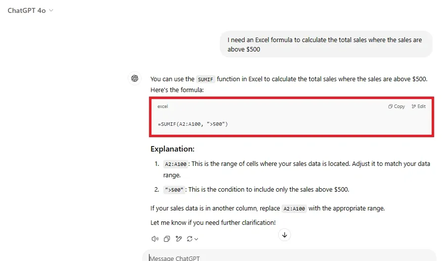 - 这样可以确保 ChatGPT 理解条件并根据您的需求生成公式。