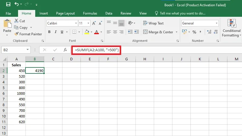 - 例如 :如果您的销售数据在 B 列,请粘贴 =SUMIF(A2:A100, ">500") 并检查它是否计算出正确的总计。