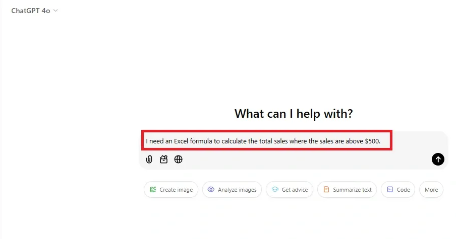 - 提示 :"我需要一个 Excel 公式来计算销售额超过 500 美元的总销售额 。"