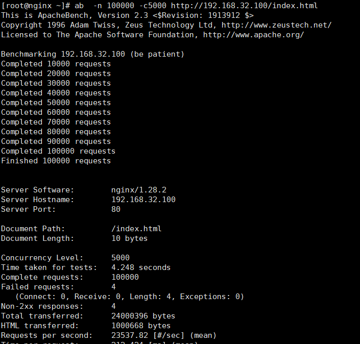 [root@Nginx ~]# ab -n 100000 -c5000 http://172.25.254.100/index.html