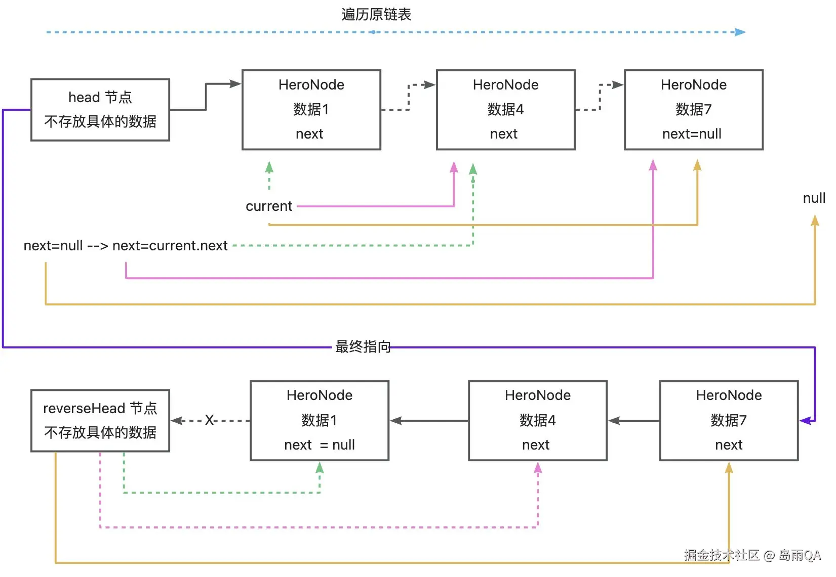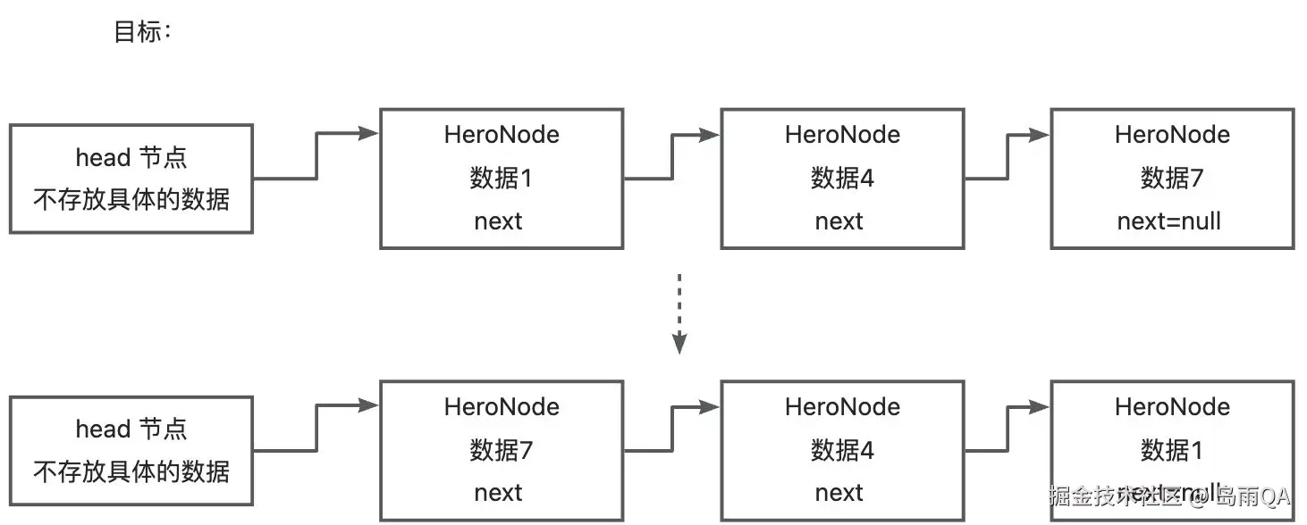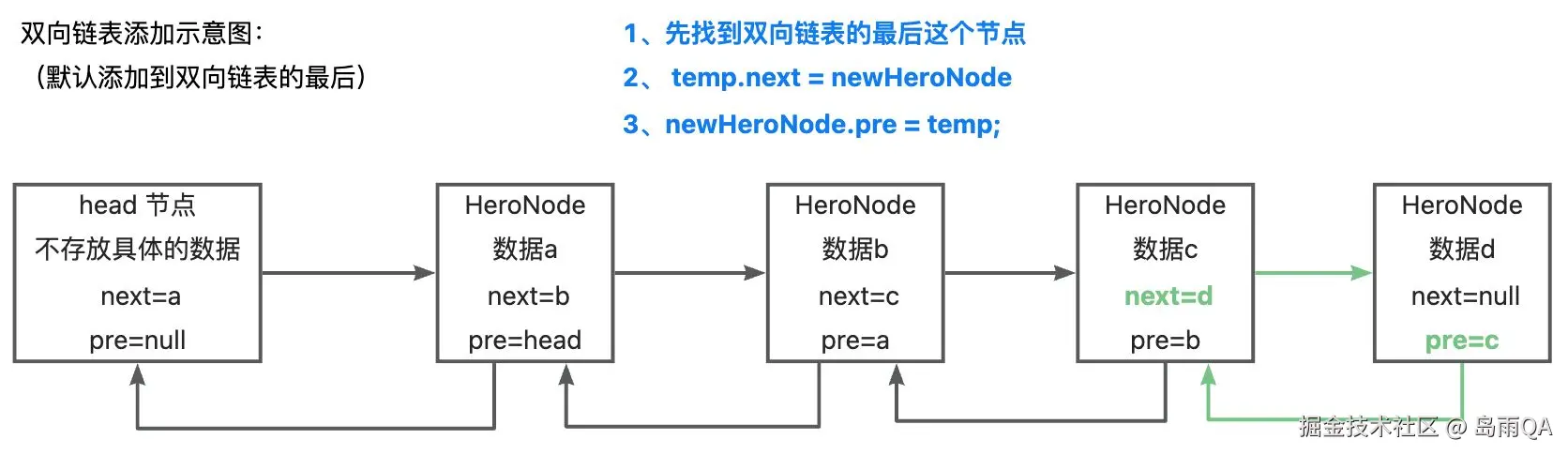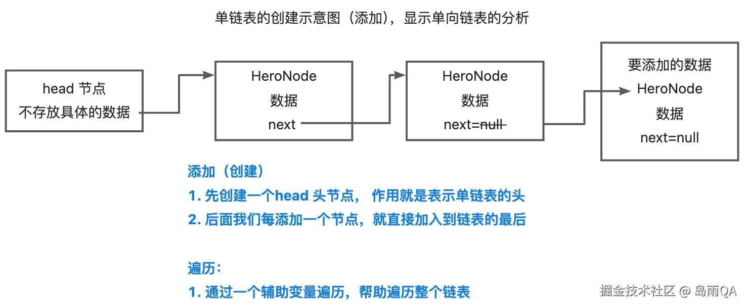 - 第一种方法在添加英雄时,直接添加到链表的尾部,思路分析示意图如下: