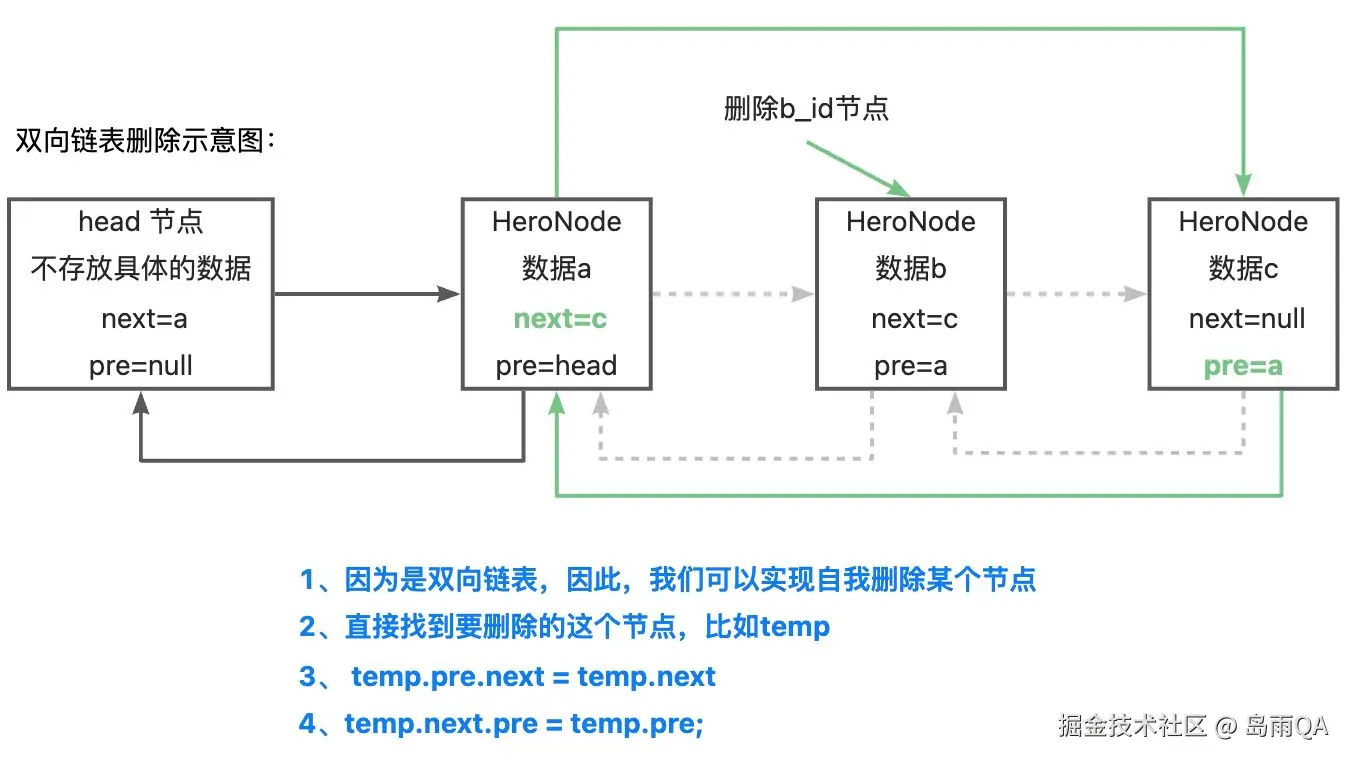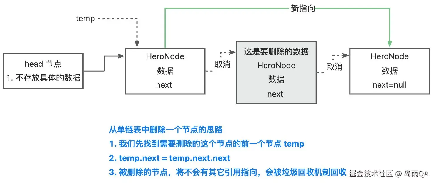 * 2、说明我们在比较时,是temp.next.no和需要删除的节点的no比较
