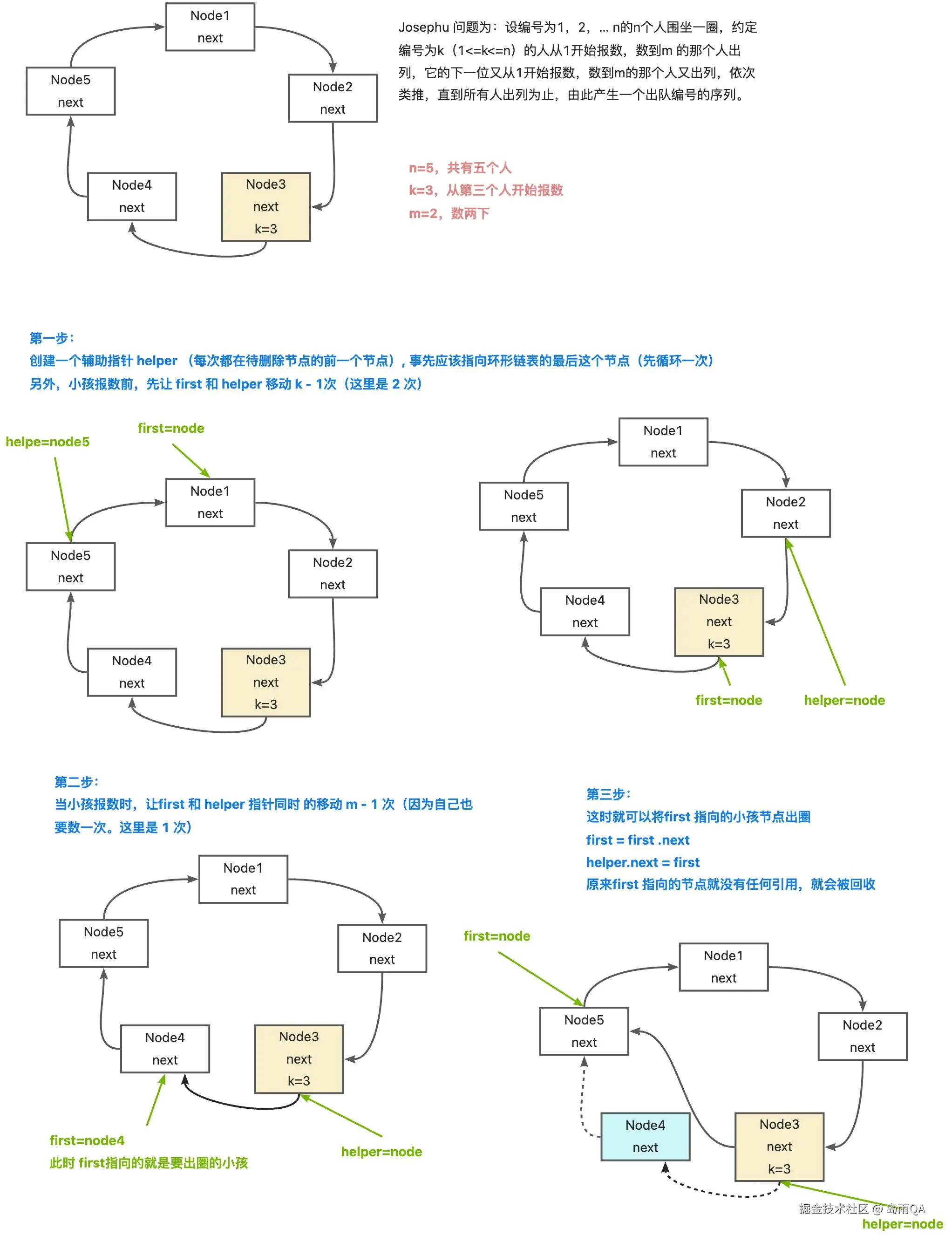 // 当小孩报数时,让first 和 helper 指针同时的移动 countNo - 1 次,然后出圈