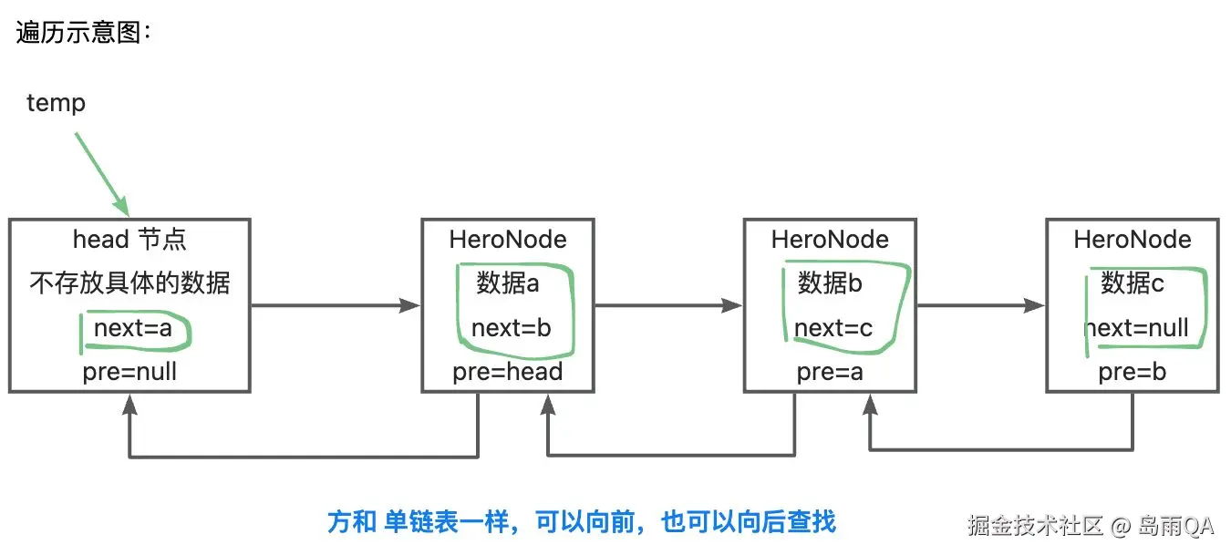 temp = temp.next; // 如果没有退出,继续后移,遍历当前链表