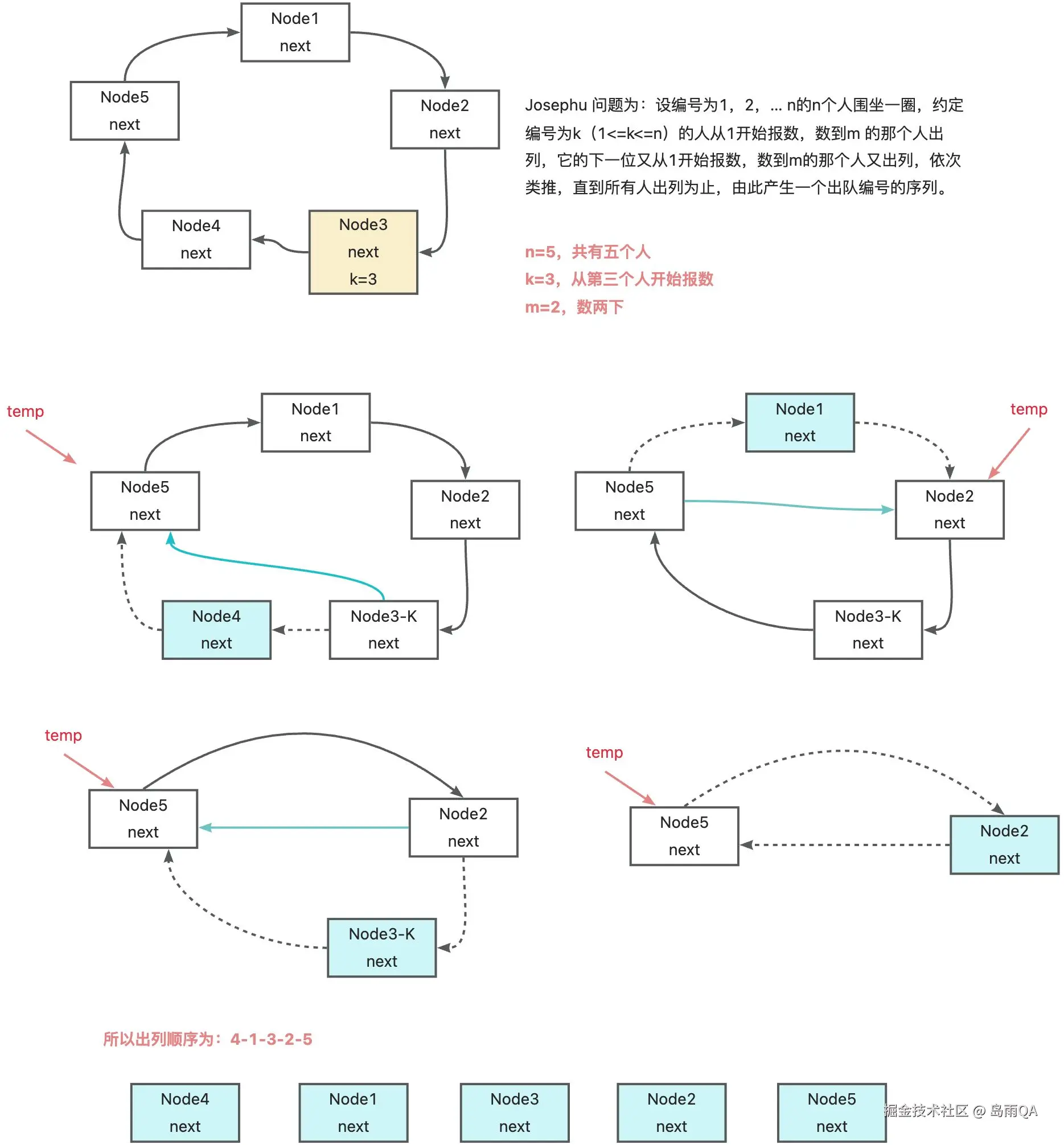 Josephu问题为:设编号为 1,2,... n 的n个人围坐一圈,约定编号为k(1<=k<=n)的人从1开始报数,数到m 的那个人出列,它的下一位又从1开始报数,数到m的那个人又出列,依次类推,直到所有人出列为止,由此产生一个出队编号的序列。