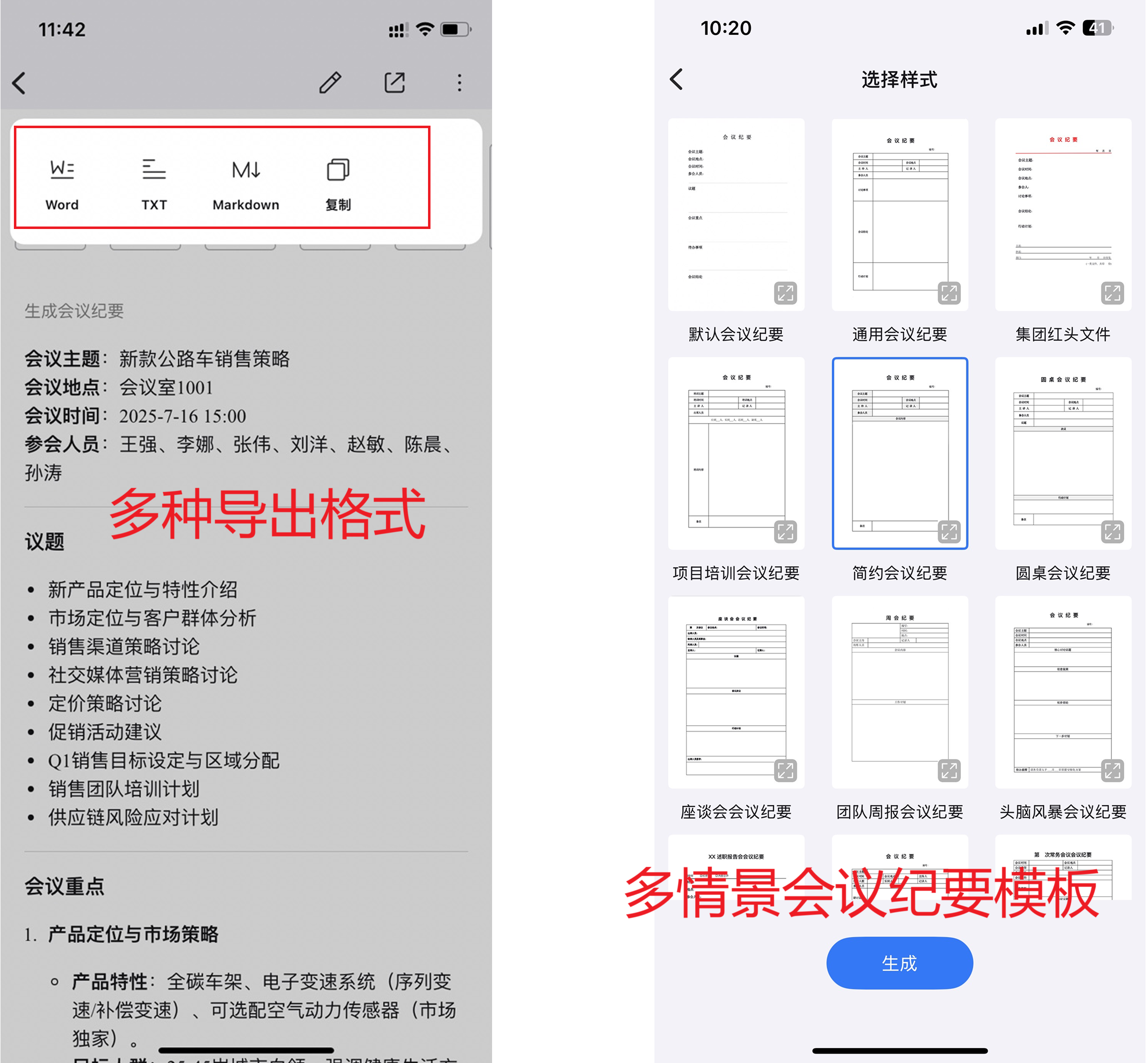 - AI自动处理:系统自动转写、区分说话人、生成会议纪要