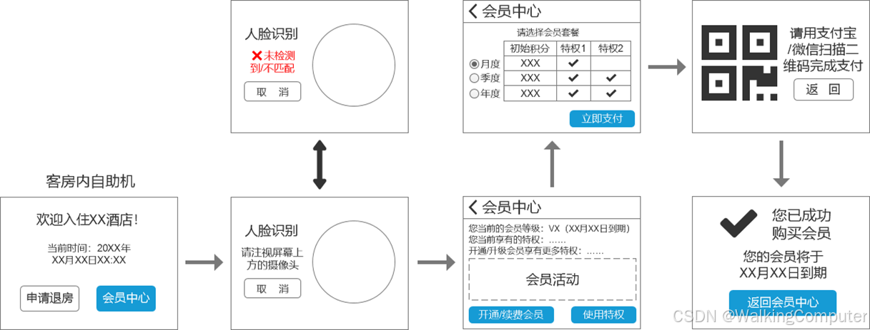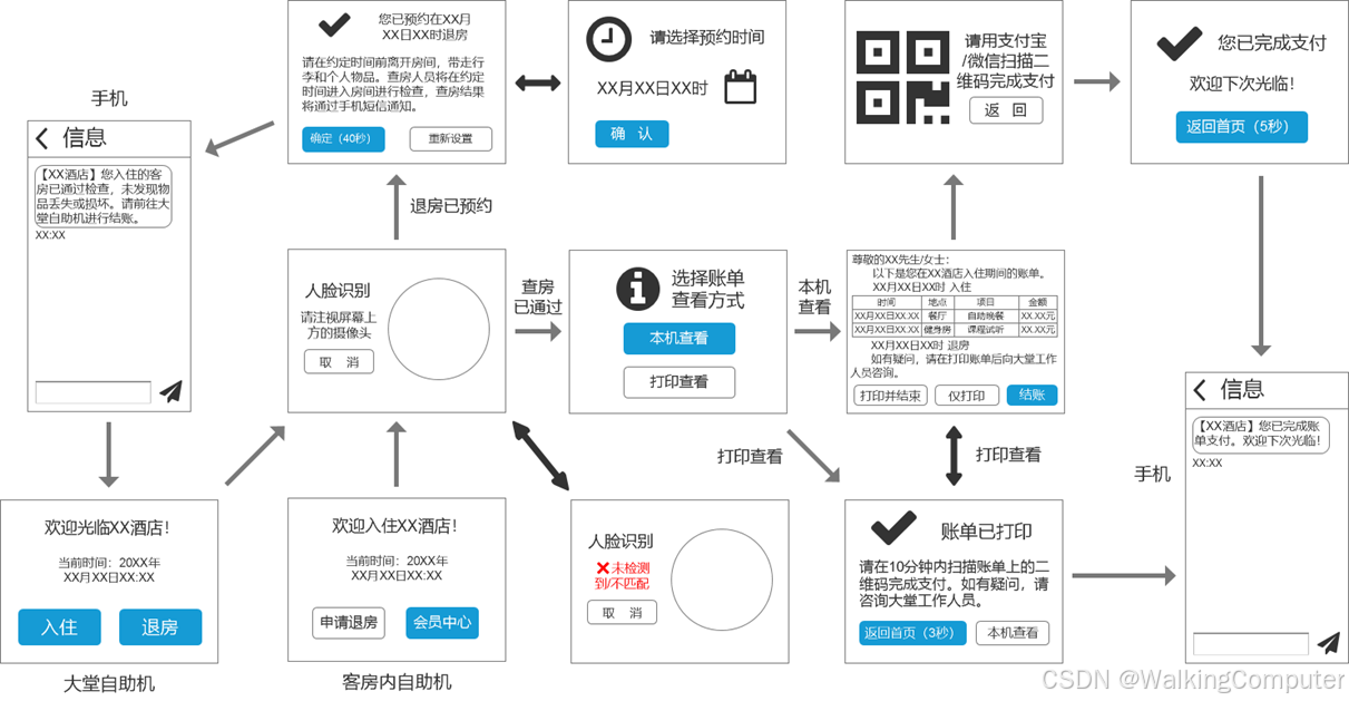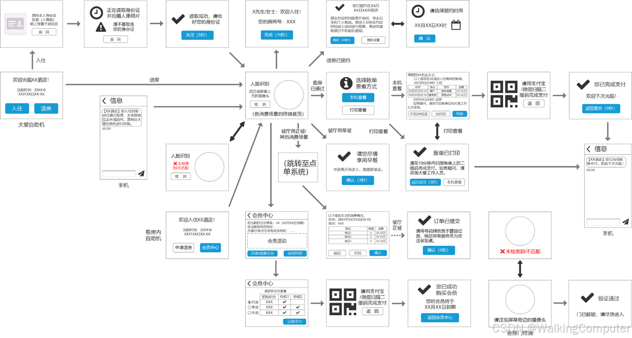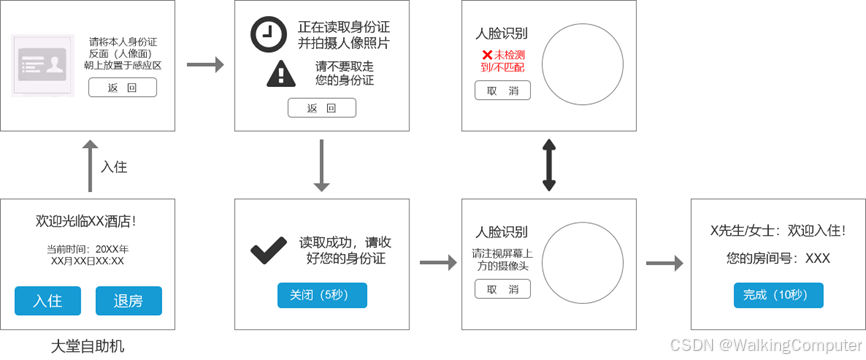 - 房客需要提前在第三方平台预定好房间(暂不支持现场选房)。到达酒店后,在自助机上刷脸、刷身份证进行身份验证,即可完成入住,系统会自动录入房客的人脸数据。