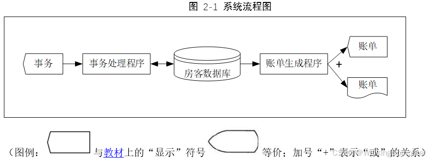 酒店使用一台中型计算机处理操作房客数据库和产生账单的任务。房客涉及到人脸识别的消费行为和房务统称为事务,通过酒店各场景中的终端把事务传输到计算机处;系统中的事务处理程序对事务进行处理,操作处理在磁盘上的房客数据库。最后,房客在退房时读取磁盘,并且把账单交给终端显示或打印成纸质文件。由此画出的系统流程图描述了上述系统的概貌。