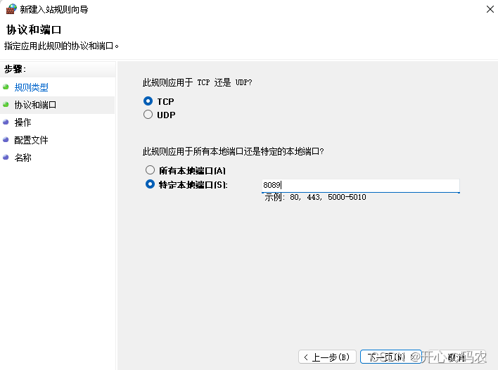 根据需求新建规则。一般设置为某个端口,只需:选择"端口",下一步;