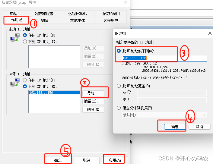 作用域------远程IP地址------下列IP地址------添加------确定