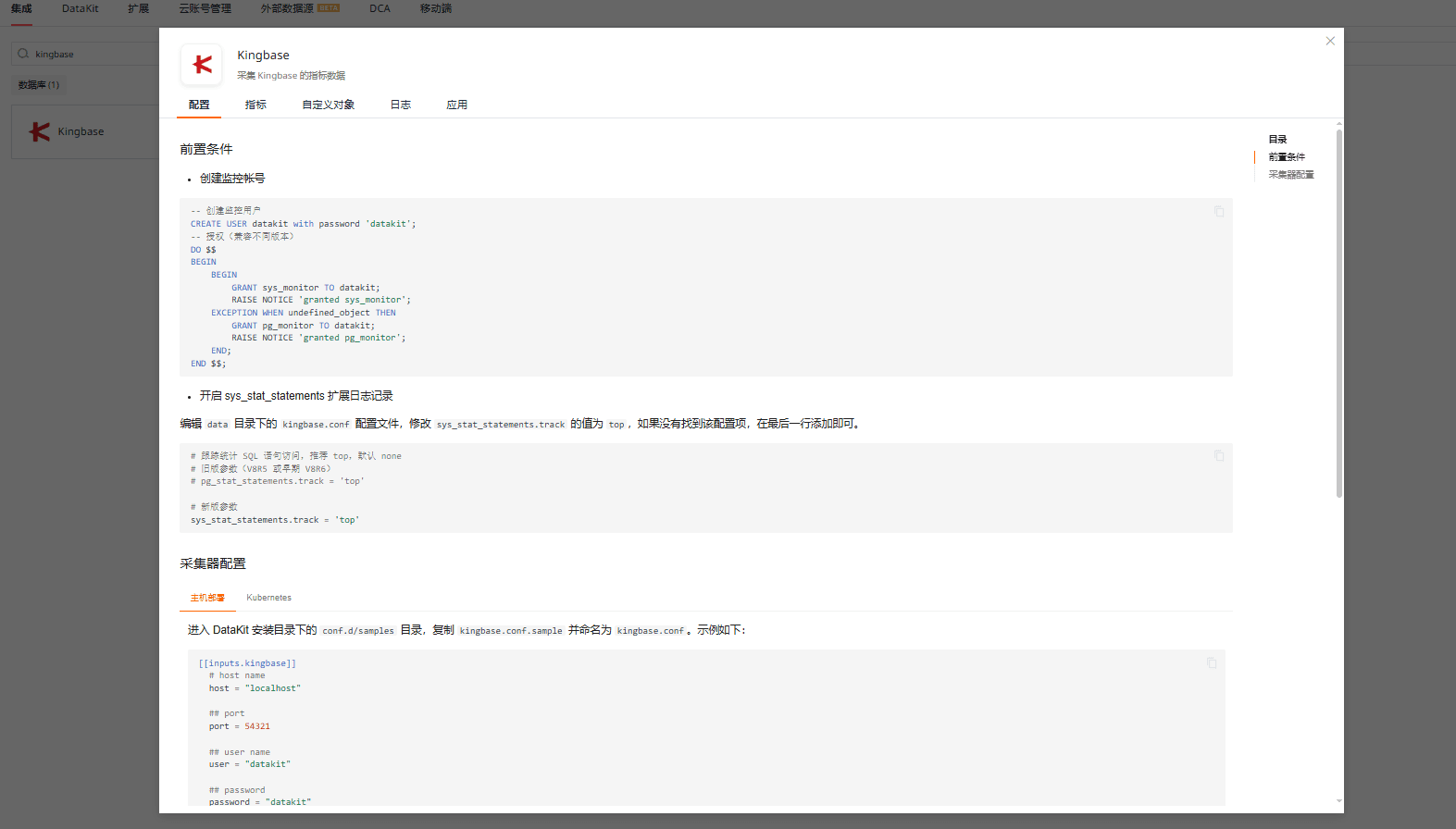 配置 kingbase ,数据库用户创建参考文档链接 https://docs.guance.com/integrations/kingbase/
