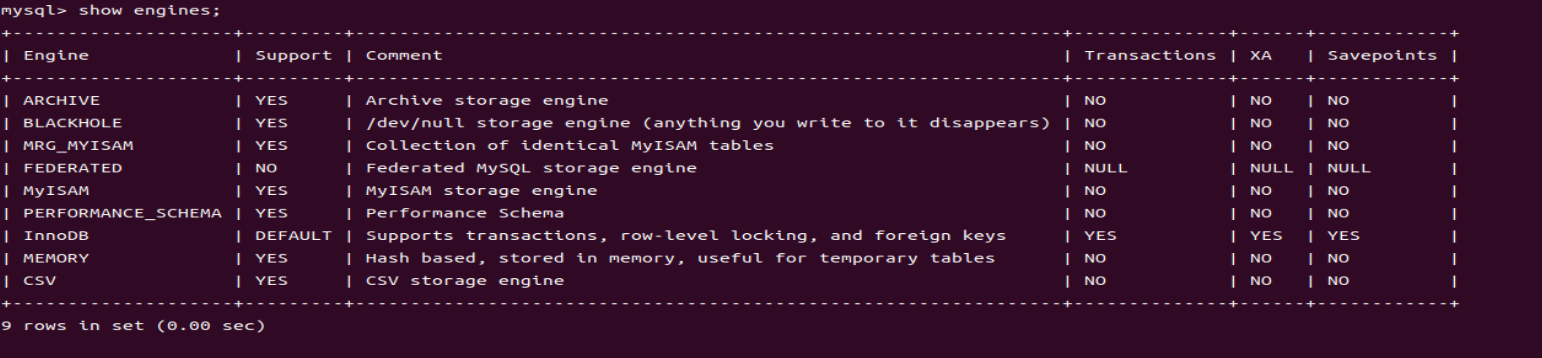 可以通过show engines;来查看有哪些存储引擎可以用,就像前面说的,我们常用的就是InnoDB>MyISAM