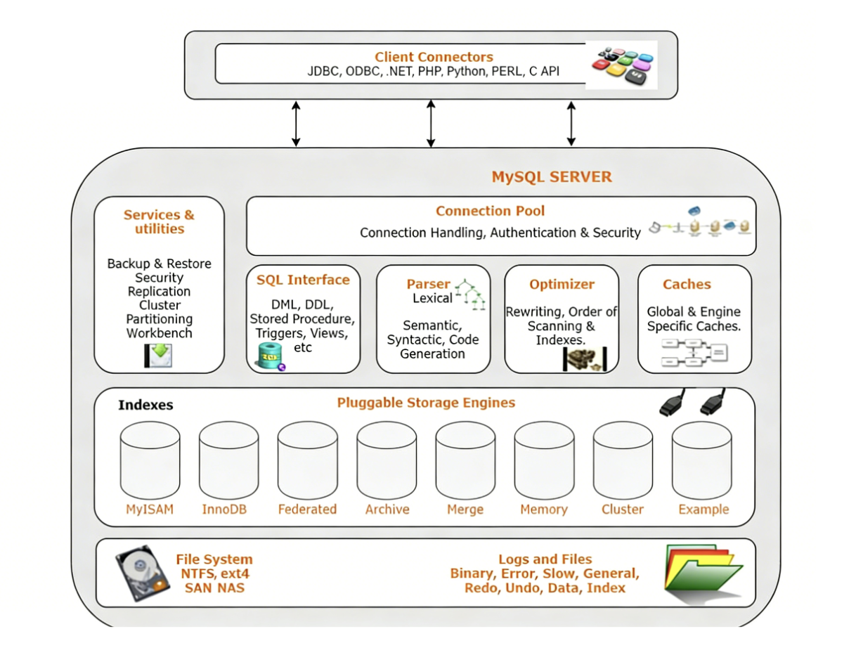 这是MySQL的体系结构,我们的客户端除了mysql,还有像把数据库接入C++直接使用;连接池的话主要是进行安全验证,授权等登录相关的;接下来的一层可以理解为解析分析MySQL语句,进行语法分析,优化语句等;Pluggable Storage Engines的话就是存储引擎,这里面有好多的存储引擎可以选择,但是比较常用的就是InnoDB,也就是我们之前配置文件中设置的,其次就是MyISAM,别的就用的比较少,而且可以看到图中还有可插拔图标,允许不同的表使用不同的存储引擎,以适应不同的业务场景,"主要干活"的就是这一层;接着就是物理文件和系统层。像我们平时对文件进行处理什么的,也可以比作是数据库操作,因此从操作系统的角度去理解的话,除了最后一层,其余的都是"用户层"。