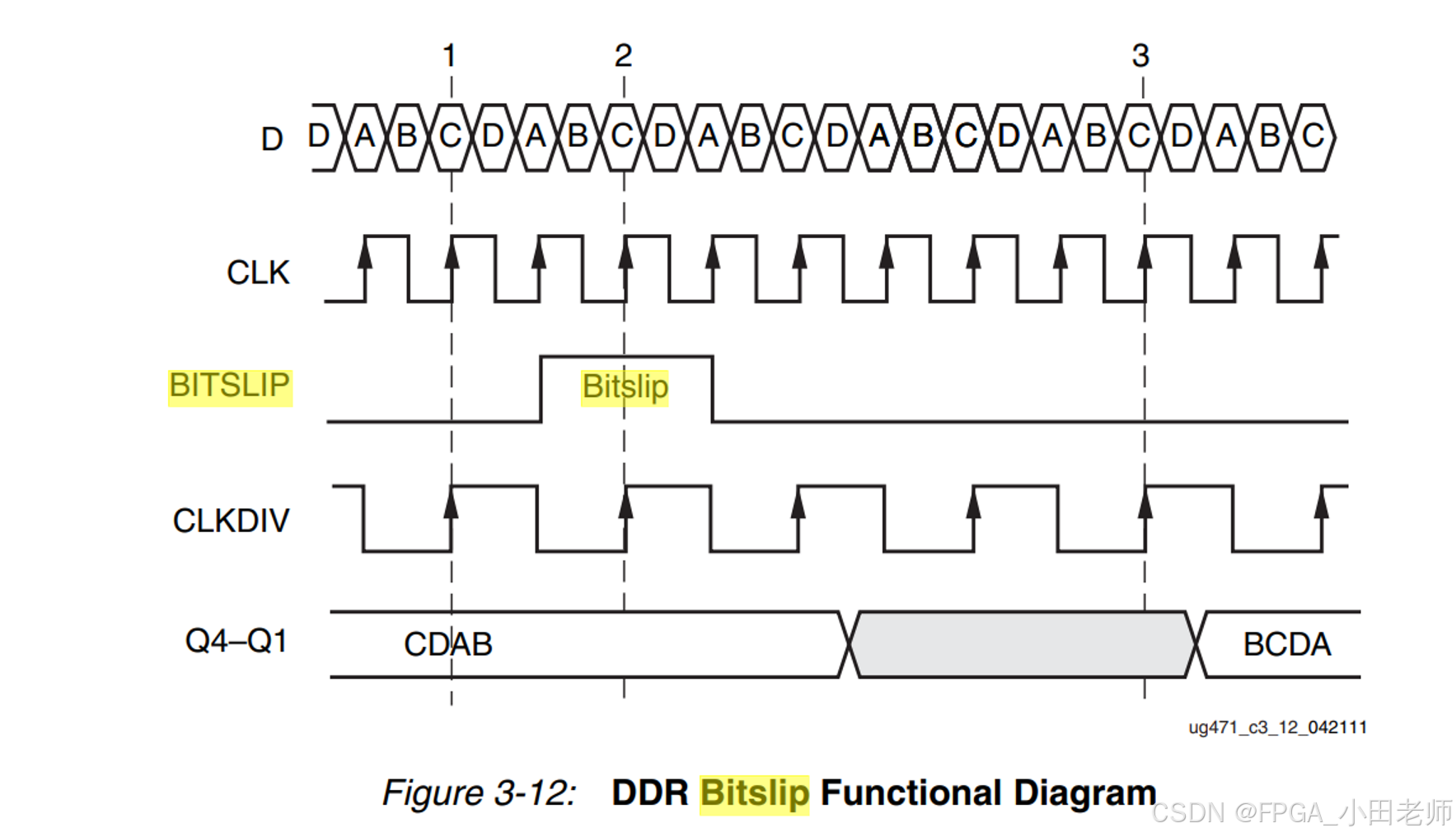 在SDR模式下,每次Bitslip后需等待至少2个CLKDIV周期 再检查数据;DDR模式下需等待至少3个周期