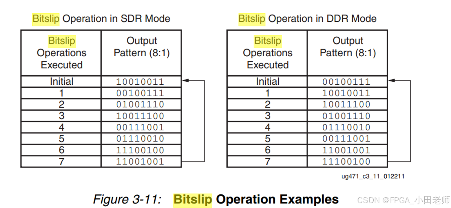 SDR模式 :每次Bitslip操作使输出模式左移1位