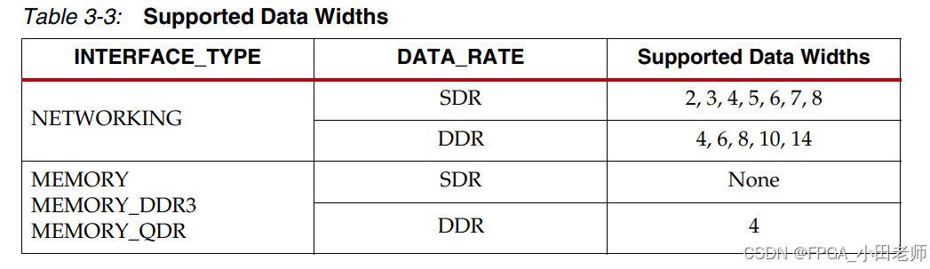 | DATA_WIDTH | 并行数据宽度 | 与INTERFACE_TYPE和DATA_RATE相关 |