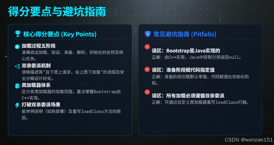 | 自定义类加载器父加载器错误 | 错误:把父加载器设为 Bootstrap/Extension(层级太高),导致应用类/依赖类加载失败;解决:将父加载器设为 Application ClassLoader,利用它加载 classpath 下的所有应用类 |