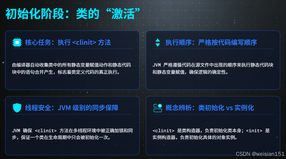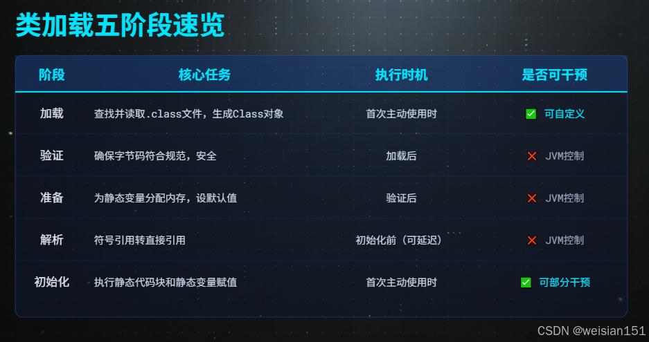 | 初始化 | 执行静态代码块和静态变量赋值 | 首次主动使用时 | ✅ 可部分干预 |