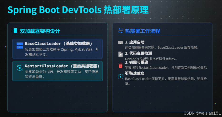| 重启速度 | 极快(几百毫秒),因为第三方依赖类不用重新加载 |