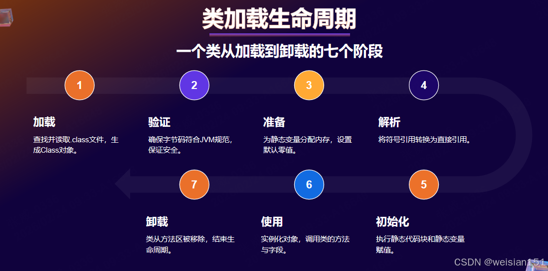一个类从被加载到 JVM 内存中开始,到卸载出内存为止,它的整个生命周期包括以下 7 个阶段: