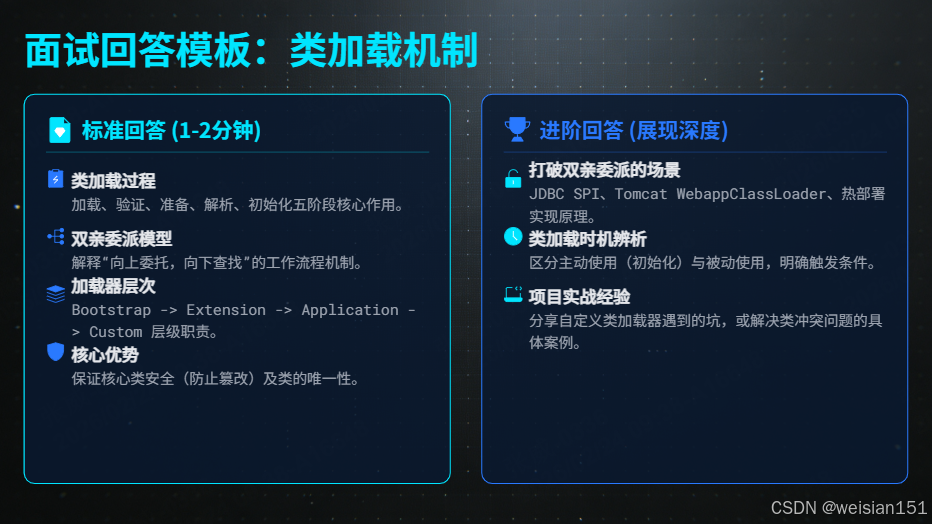 今天,我们将从类加载过程、双亲委派模型、类加载器层次、打破委派场景、实战应用 五个维度,层层递进地拆解这道面试必考题,并附上创作思路、得分要点、避坑指南,助你面试中脱颖而出。