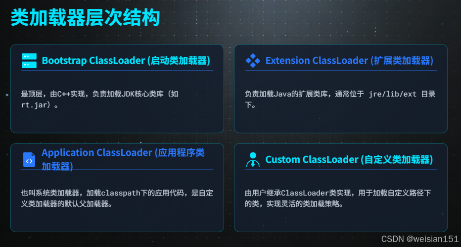 | 加载 | 查找并读取.class 文件,生成 Class 对象 | 首次主动使用时 | ✅ 可自定义 |