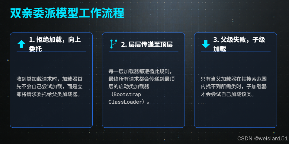 | 1. 加载流程 | 调用 loader.loadClass("com.example.MyService") 时,因为双亲委派,先委托父加载器(Bootstrap ClassLoader)加载 |