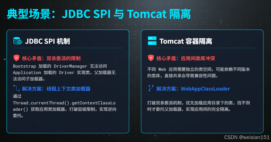 | 核心规律 | 遵循双亲委派:为了「安全 + 避免重复加载」(比如核心类不被篡改);打破双亲委派:为了「灵活 + 定制化」(比如热部署、容器隔离、SPI 加载) |