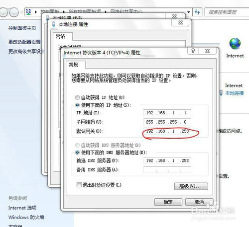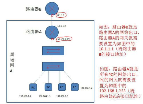 PC设置网关即为路由器内网(局域网LAN口)地址,如上拓扑图中的路由器A的内网口地址192.168.1.253。