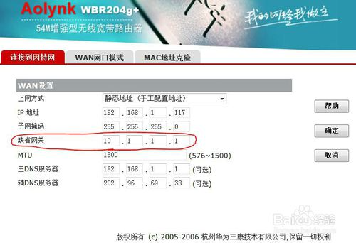 通过WEB页面登录路由设置页面,在WAN口设置中可以对网关进行设置,如下图。