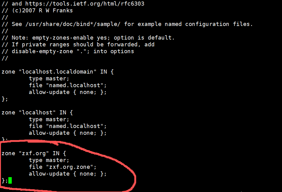[root@RS1 named]# cp -p named.localhost zxf.org.zone